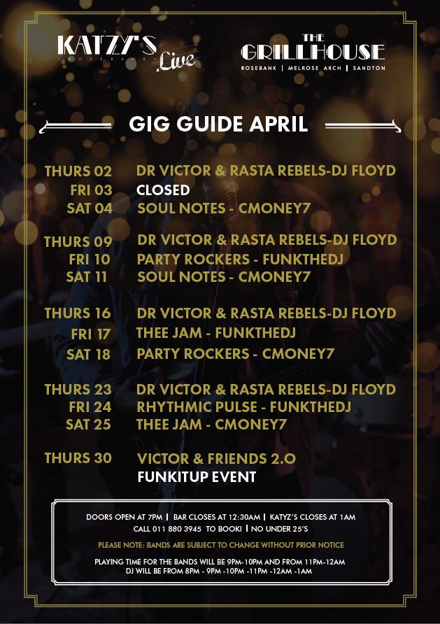 There isn’t a night time venue in Joburg that offers quite what Katzy’s Live Wine Bar does – a place to be seen, and which has resident bands performing 3 nights a week, the Grillhouse menu, a stellar wine bar, cocktail and cigar list, and more than 100 different whiskeys, fine cognacs and bourbons to choose from.